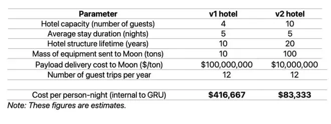 按照 GRU 的模型,第一版酒店的设备总重约 10 吨,内部成本约每人每晚 42 万美元;到了使用 ISRU 部分本地化建造的第二版酒店,这个数字可以降到 8 万美元左右。