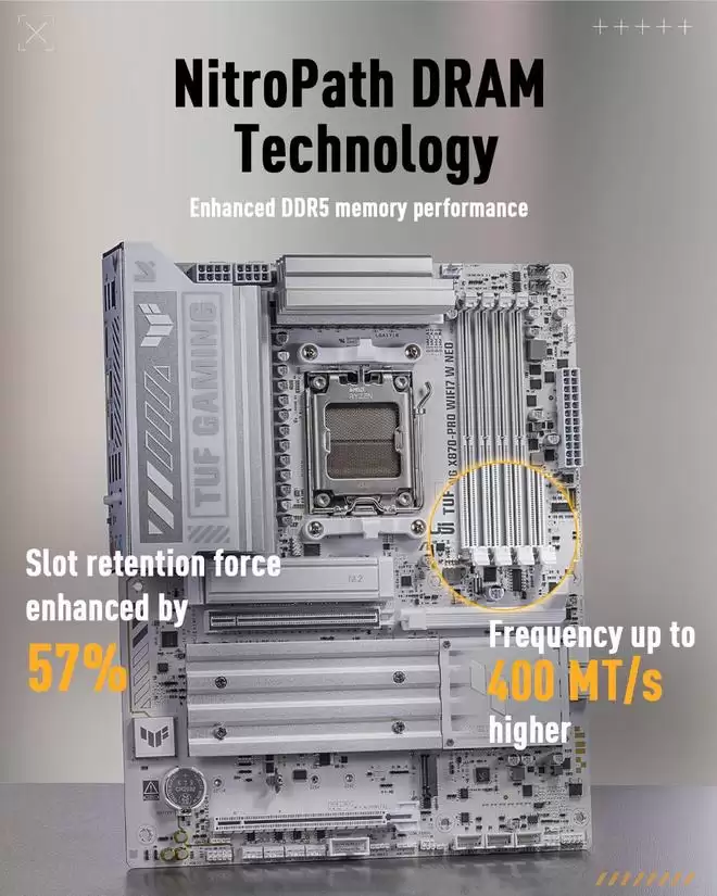具体来看,NitroPath技术额外提供了400MT/s的内存超频空间,金手指针脚缩短超过70%,插槽保持力增强多达57%。