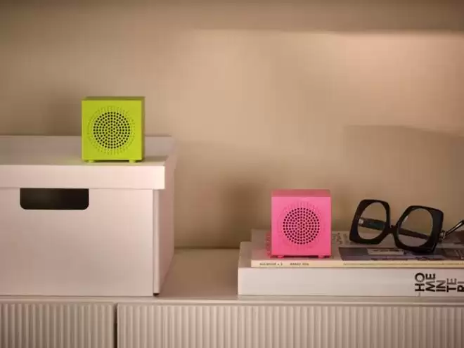 Kallsup采用了极简的立方体造型,机身尺寸约为70 x 70 x 70毫米,整体采用塑料材质打造。音箱底部配备了四个防滑脚垫,无论是随身携带还是摆放在桌面上都相当稳固。为了迎合年轻消费群体的个性化喜好,宜家为其提供了亮粉色、亮绿色和白色三种时尚配色选择。