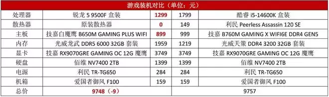 由于酷睿i5-14600K的功耗更高,所以主板档次不能差,盒装也不带散热器,不能随便买,玩家不得不在这些方面投入更多的预算,导致整机成本增加。锐龙5 9500F盒装自带的散热器就能保证日常使用,又能节约不少钱。就算搭配高配版B650,其价格还是更低。再加上近期DDR5价格有所回调,综合下来,这套锐龙5 9500F配置的成本反而低了9元。