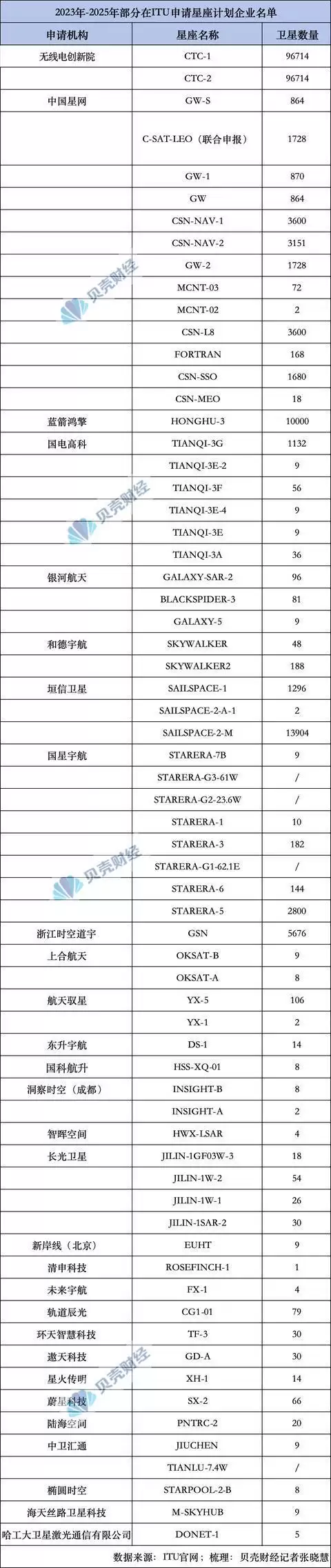 据新京报贝壳财经记者不完全梳理,目前,中国星网、上海垣信、蓝箭鸿擎、无线电创新院向ITU(国际电信联盟)提交的星座规模均达到10000颗卫星以上;2024年以来,我国共有超过60家机构向ITU申报卫星资料,行业覆盖范围极其广泛,既有中国星网、上海垣信、中国卫通等央国资背景企业,也有清华大学、北京大学、中科院、鹏城国家实验室等科研力量,还有蓝箭鸿擎、银河航天、长光卫星、国星宇航等庞大的商业航天队伍。
