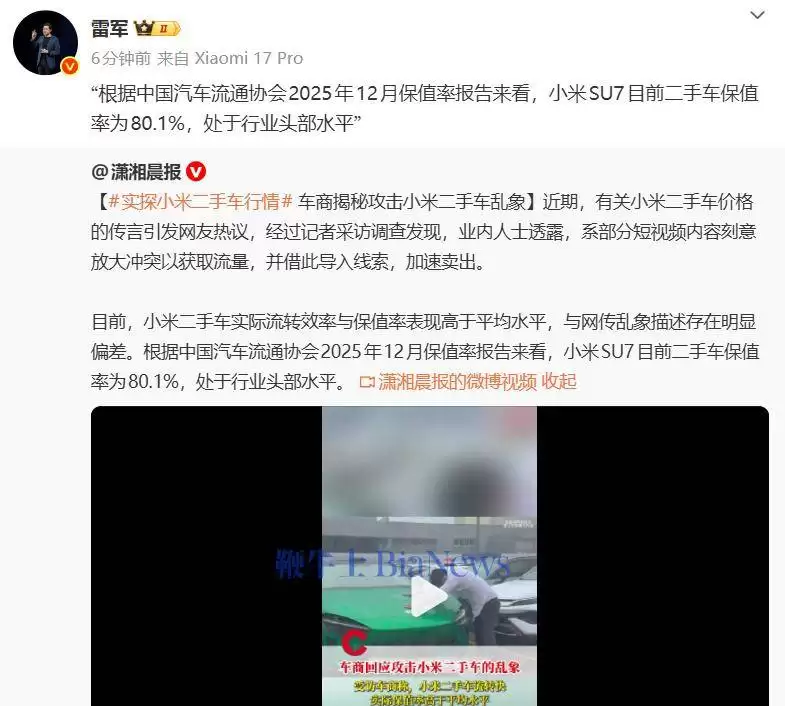 最近,关于小米二手车价格的讨论在网上热度不减,一些短视频平台流传的“小米二手车价格暴跌”等说法更是引发了广泛关注。然而,中国汽车流通协会发布的最新报告显示,小米SU7在2025年12月的二手车保值率达到了80.1%,其实际流转效率与市场表现均处于行业领先水平,这与网络上的传言存在明显出入。