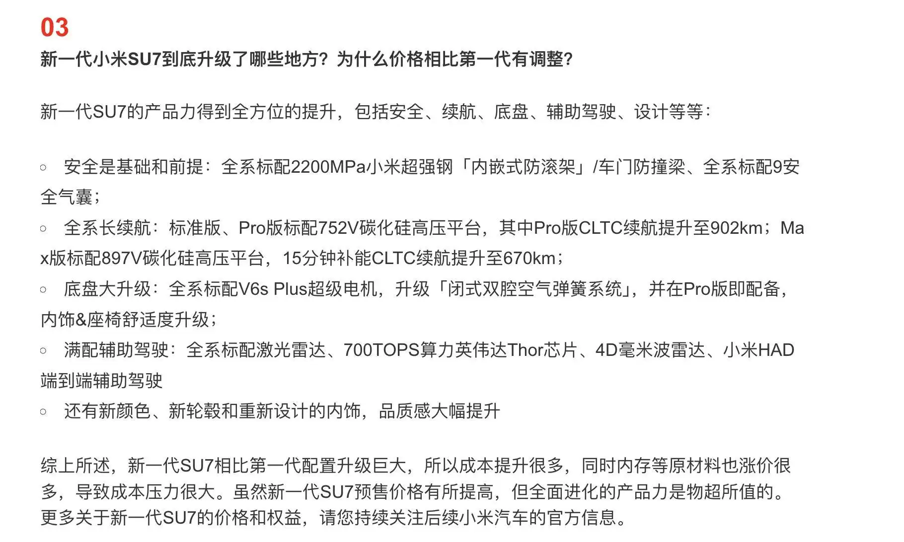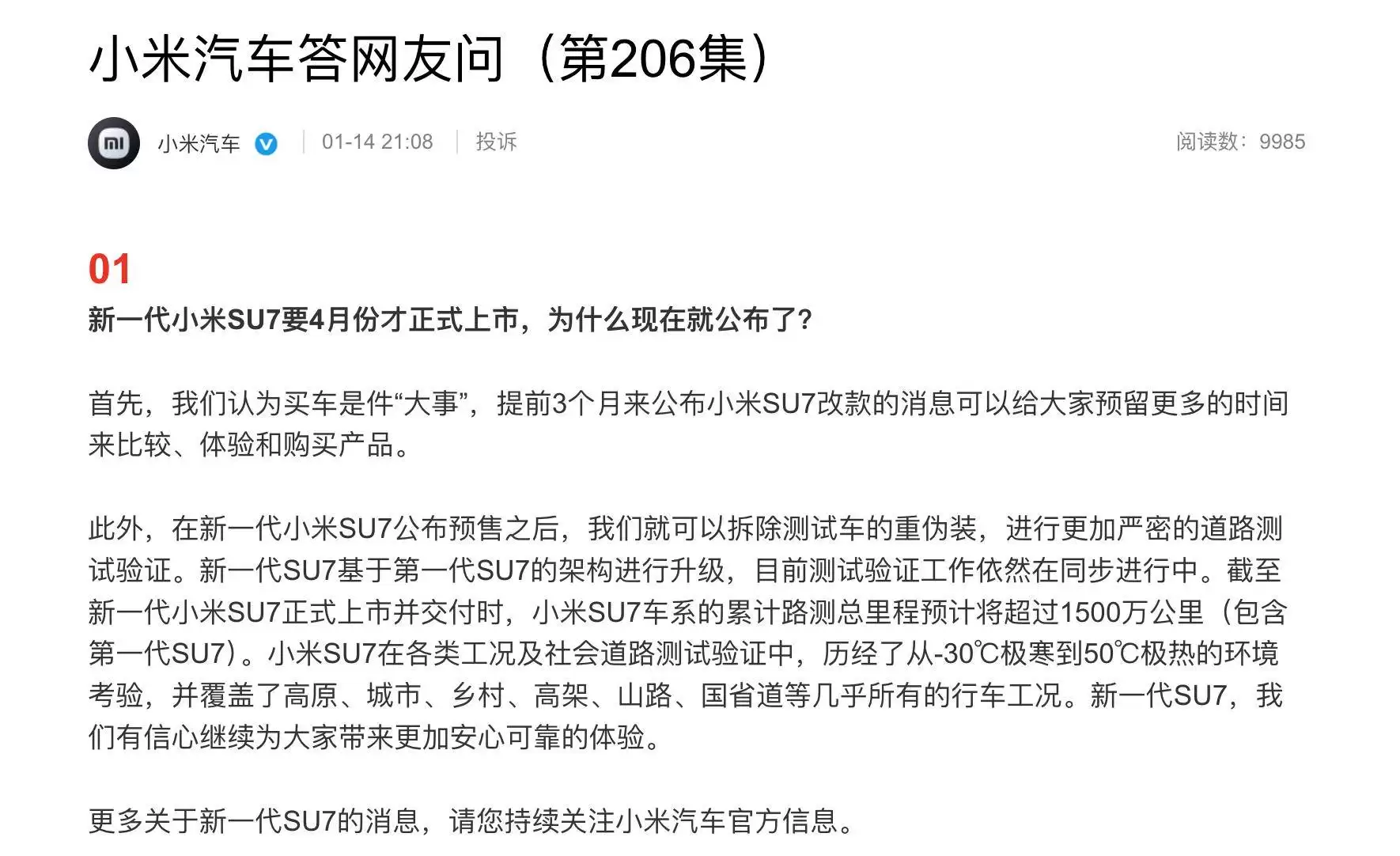 小米汽车近日通过官方渠道回应了网友们关于新一代SU7的多个疑问,其中最受关注的是新车上市时间提前公布的原因。最新解释称,汽车消费决策周期较长,提前三个月披露改款信息旨在为消费者预留充足的比较、试驾和购买准备时间。这一策略不仅体现了对用户需求的重视,也为后续市场推广预留了缓冲期。