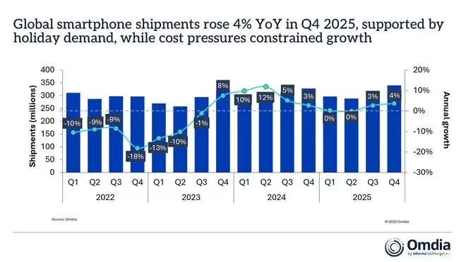 1月15日,据IT之家报道,市场调研机构Omdia发布最新数据,2025年第四季度全球智能手机出货量同比增长4%。其中,苹果凭借iPhone 17系列的强劲市场表现,以25%的份额创下第四季度历史新高,并连续第三年蝉联全球年度销量冠军。