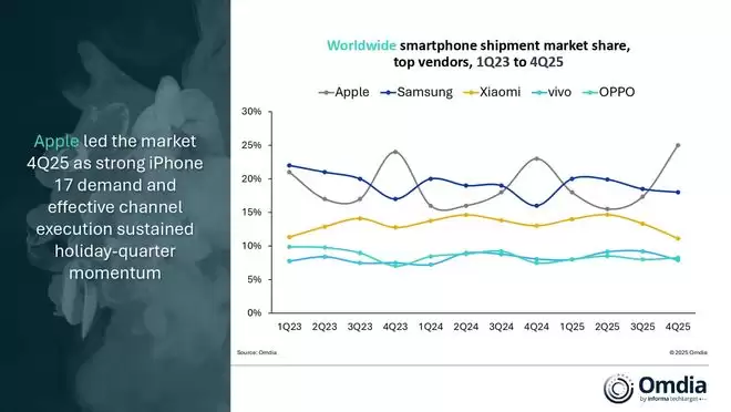 Omdia首席分析师Sanyam Chaurasia指出,iPhone 17系列旺盛的市场需求,以及旧款机型持续热销,共同推动了苹果在2025年第四季度创下出货量历史纪录。