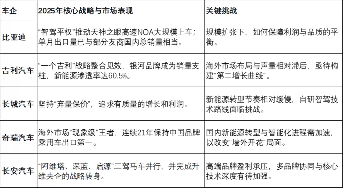 在自主品牌“五常”阵营中,2025年呈现出迥异的战略选择和处境,下表梳理了其核心特点: