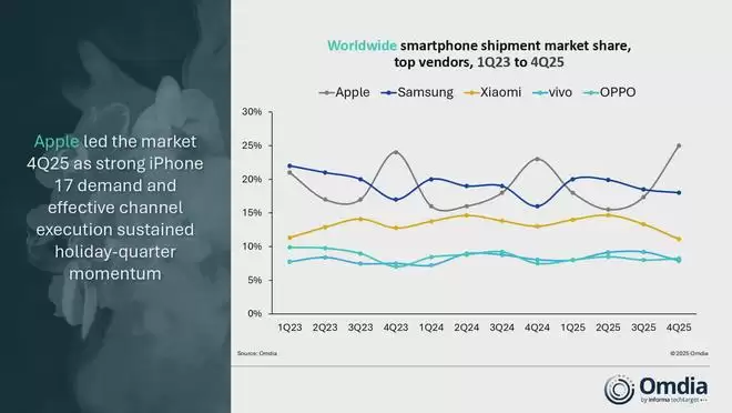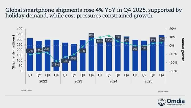 1月14日,知名数据分析公司Omdia正式发布了2025年第四季度全球智能手机市场报告。这份报告的标题为“2025年第四季度全球智能手机市场增长4%,苹果连续第三年引领市场”。