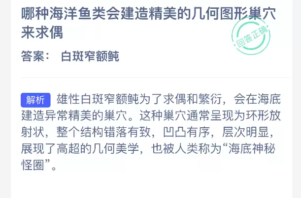 海洋鱼类如何用几何巢穴求偶?支付宝神奇海洋今日答案