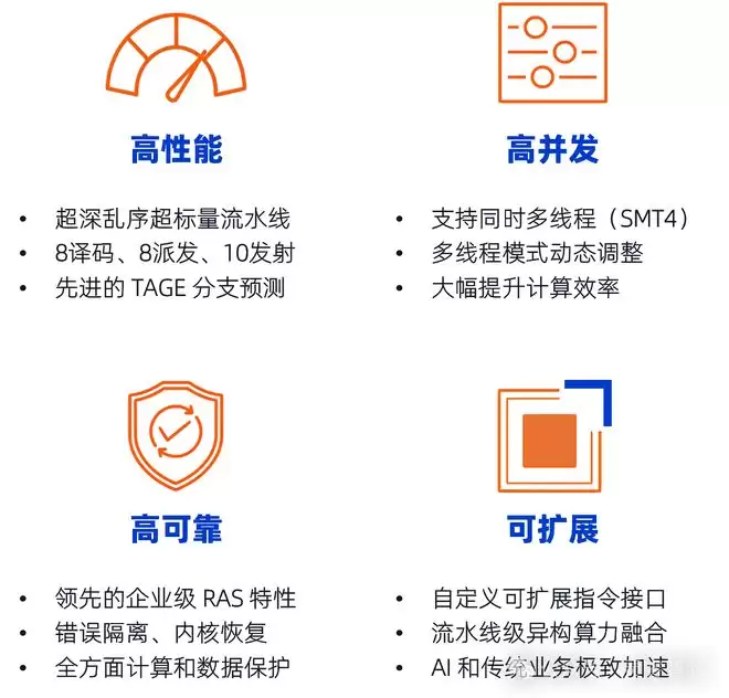 高并发:P100是国内唯一支持动态同时多线程(SMT)技术的CPU内核,最高支持4线程,并可根据业务特性在SMT1、SMT2、SMT3和SMT4模式间动态灵活切换。这一设计极大提升了CPU内核的线程级并发能力,显著提升计算资源的利用率和面效(性能/面积),完美契合泛在智能时代以数据为中心的计算范式。