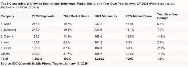 不知是调研机构之间事先有过沟通,还是时间上的巧合,全球顶尖数据公司都在1月14日发布了有关2025年全球及第四季度智能手机市场的分析报告。其中有的机构甚至涵盖了2025年国内市场全年和第四季度的完整数据。接下来,我们将基于IDC发布的年度及第四季度报告,为大家做个解读。