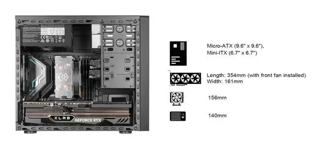银欣FARA 314机箱的三维尺寸为181×360×410毫米,体积约26.72升,拥有4条扩展槽,支持156mm高的处理器散热器、356mm长的显卡以及标准140mm长的ATX电源。