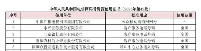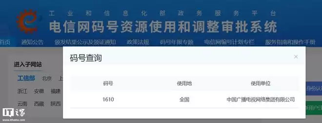 IT之家1月15日获悉,工业与信息化部于1月7日公示了2025年第42批电信网码号资源分配结果。其中,中国广播电视网络集团有限公司新增了1610号段,相关信息显示,该号段的批准用途为“公众移动通信网网号”。