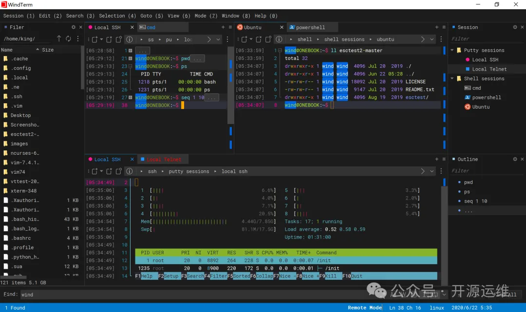 WindTerm 是一款开源跨平台终端工具,支持 SSH、Telnet、TCP、Shell、Serial 等多种协议,集成了 SFTP、文件管理器、历史命令等功能。