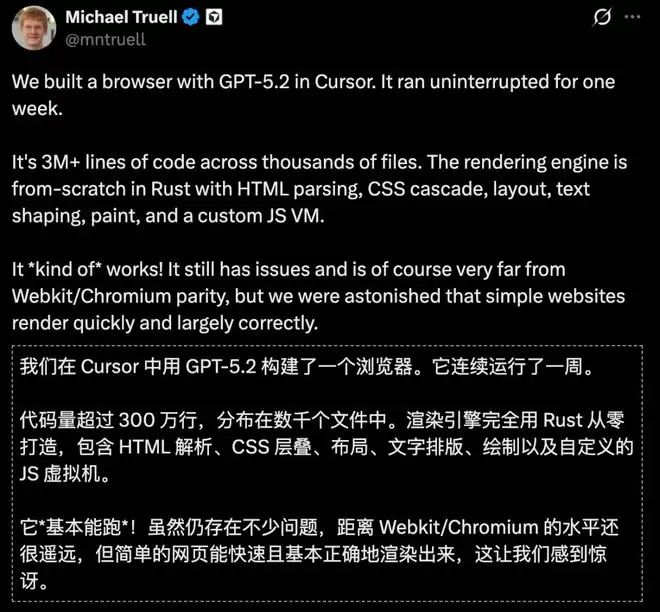 Michael Truell让Cursor中的GPT-5.2连续运行了整整一周。