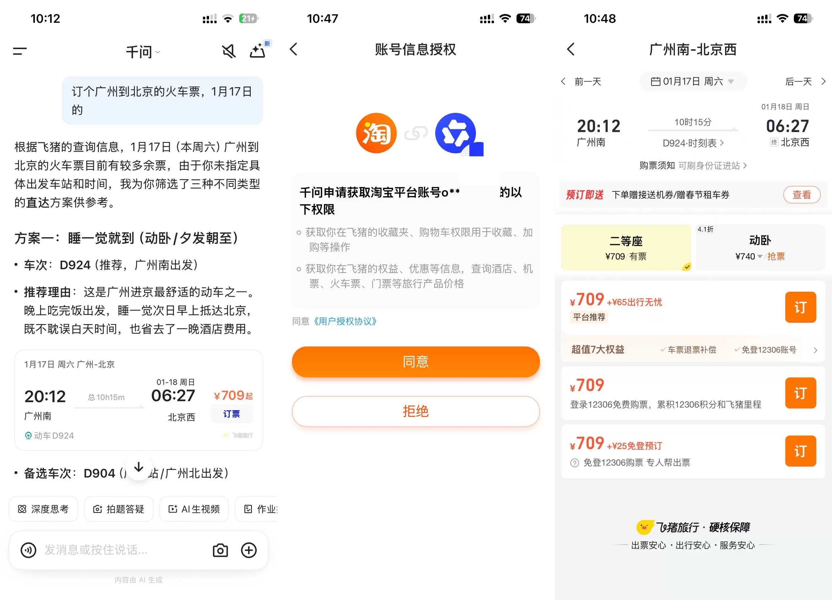 订票功能也差不多,跟千问说“帮我订明天去北京的火车票”,它就会调用飞猪的资源,给出几个合适的班次选项,选好后同样能直接走支付宝付款。