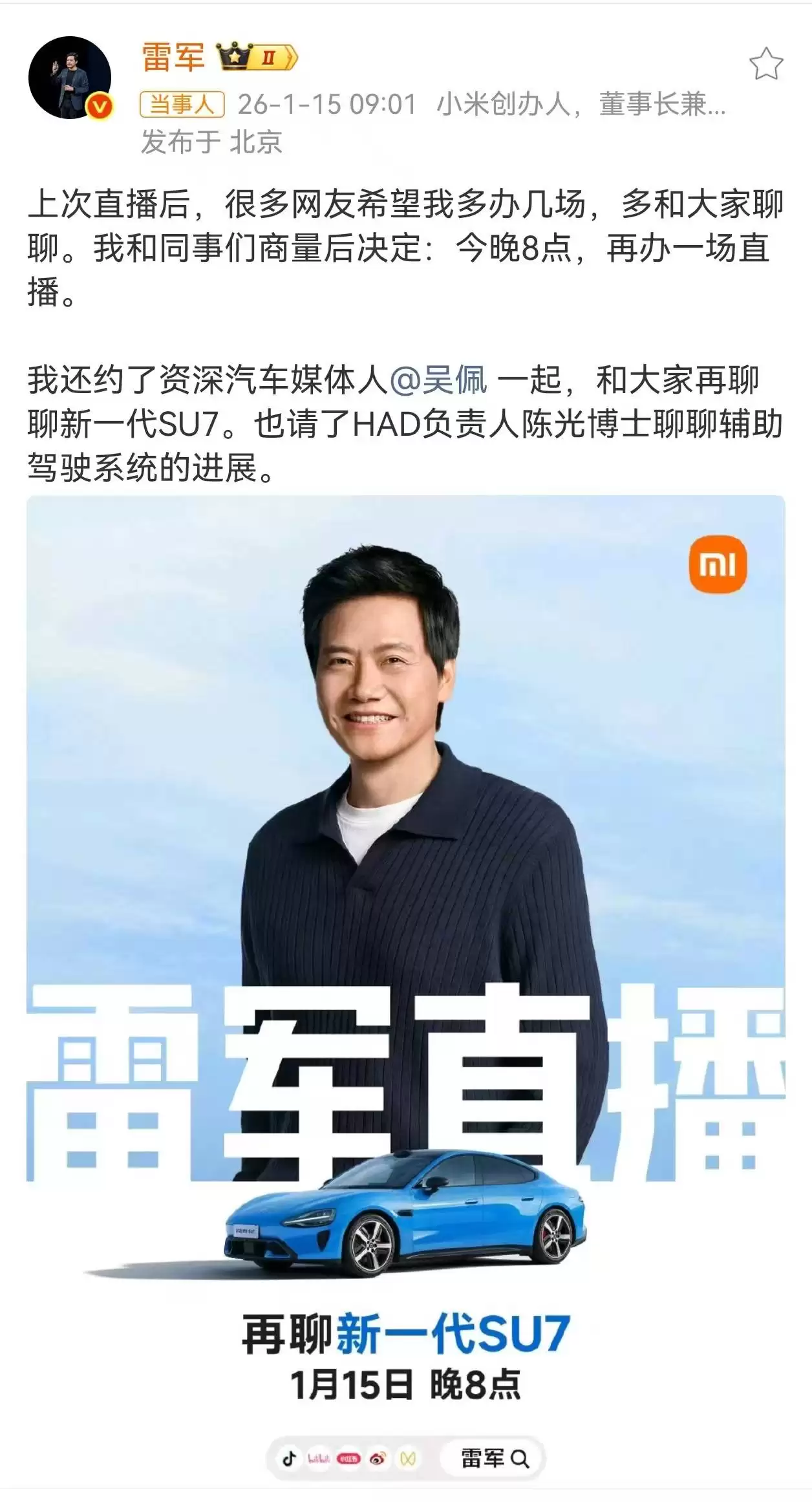 雷军1月15日晚8点直播详解SU7与智驾新进展