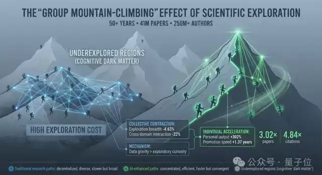 团队发现,AI的高效率产生了一种强大的“科学智能引力”效应。它引导研究者集体涌向少量适合AI研究的“热门山峰”,即那些已有大量数据、适合用现有AI方法快速出成果的研究方向。