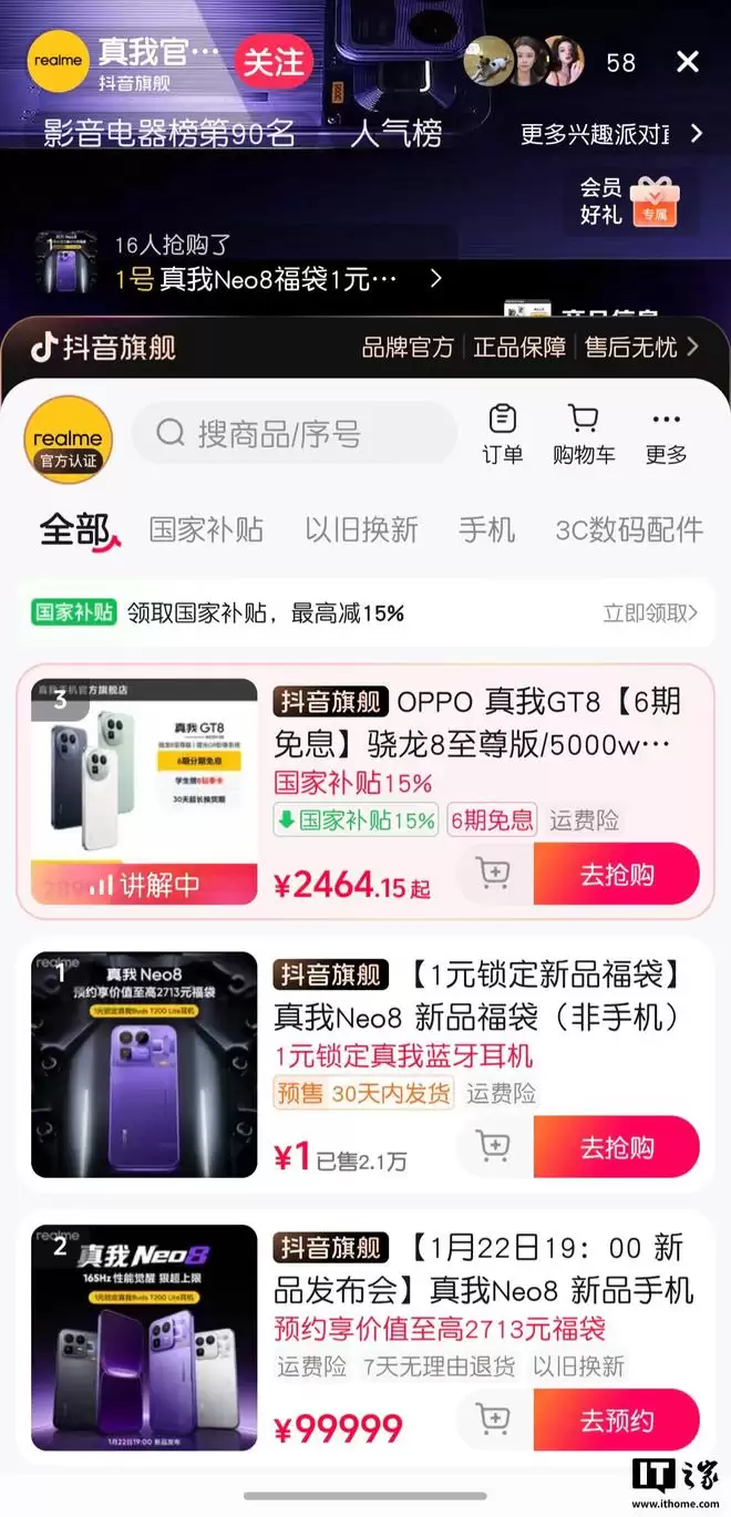 IT之家注意到,自真我官宣回归后,其目前在京东、淘宝、抖音直播间等平台的在线商品均已添加“OPPO”前缀或关键词。