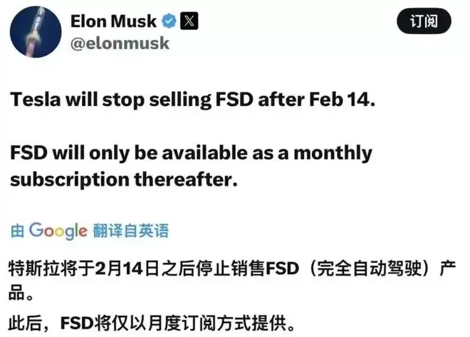 1月14日,马斯克发了一条推文,核心信息就一句话:FSD(全自动驾驶)的“一次性买断”选项,将在2月14日后停止销售,此后FSD只提供月度订阅。
