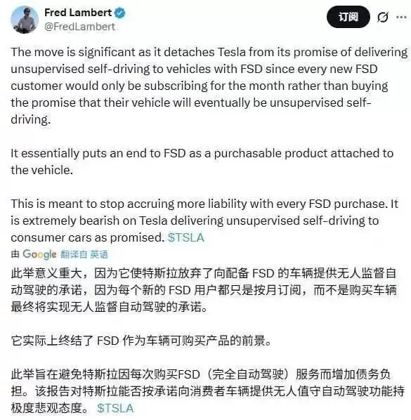 显然,在弗雷德·兰伯特看来,特斯拉转向订阅是对实现完全自动驾驶信心不足的表现。