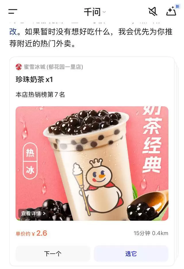 新京报贝壳财经记者实测千问App点外卖功能发现,当记者向千问App下发点外卖指令后,千问App会自动推荐记者附近的热门外卖,包含蜜雪冰城、杨国富麻辣烫、喜茶等单价为2.61元至15元不等,千问App还可以凑单并使用15元红包。用户只要在聊天框里下达指令,千问就能调用淘宝闪购等的服务能力,精准定位、推荐合适的商家、生成订单,并通过内置的“支付宝AI付”功能一键付款。