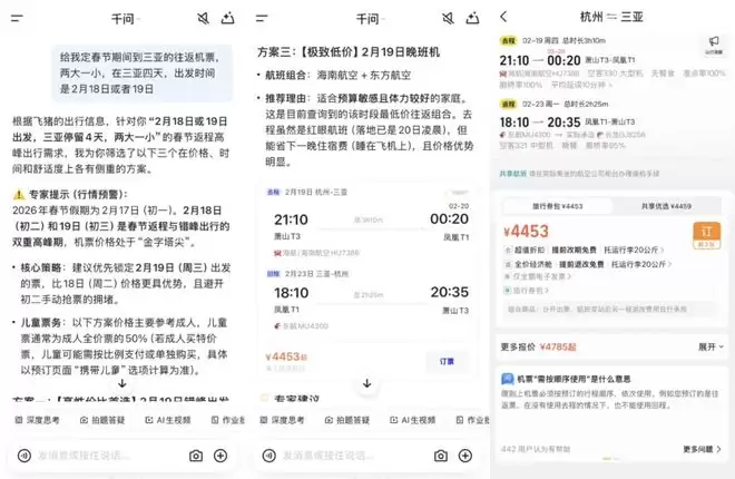 例如,用户可以让千问App帮助规划春节旅行计划。在预定机票的环节,用户可以输入“帮我定春节期间到三亚的往返机票,两大一小,三亚停留四天,出发时间是2月18日或者19日。”千问能够调用飞猪服务,综合分析春运票价走势,给出不同策略的航班方案。