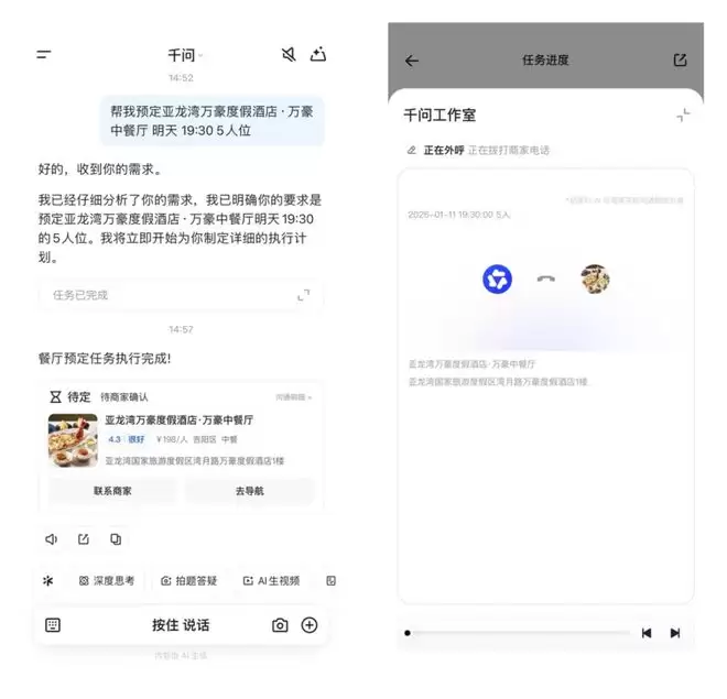 当用户提出想要预订一间适合家庭聚餐、有儿童餐且环境优美的包厢时,千问不再只是给出一个链接,而是能像真人一样拨通餐厅电话,自动沟通人数、时间及忌口细节。用户几乎分辨不出这竟然是一通AI拨打的电话。