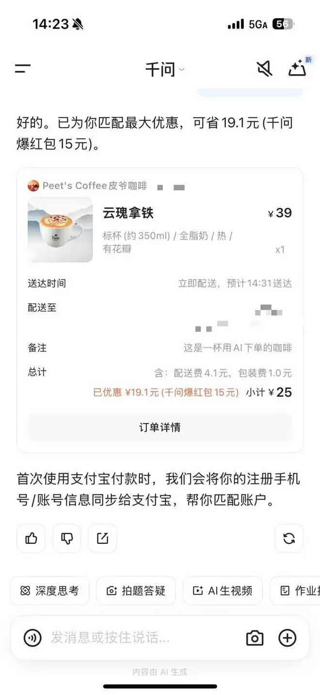 笔者第一时间也通过千问App下单了一杯咖啡,整体体验基本流畅。