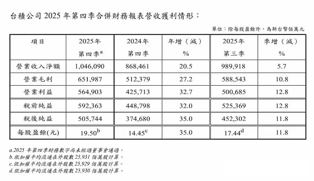 台积电2025Q4净利飙升35%,创历史新高纪录