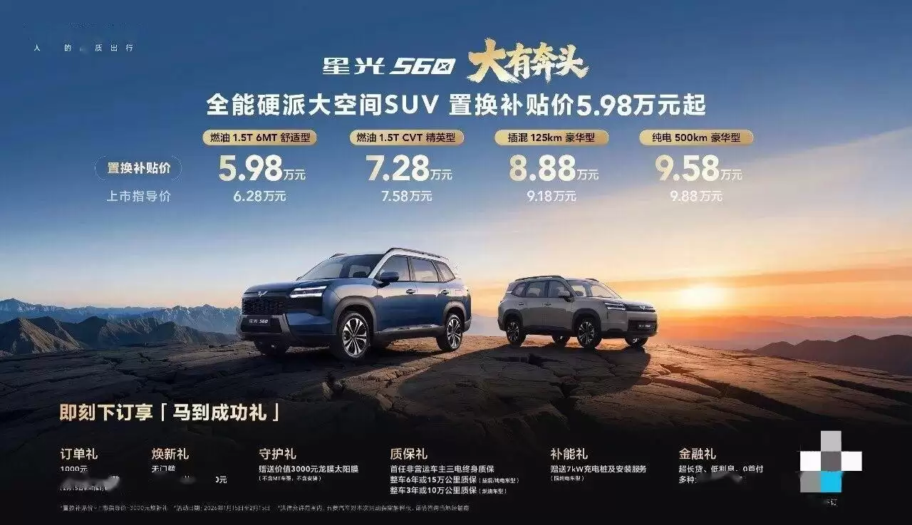 五菱汽车旗下全新中型SUV——星云560正式登陆市场,提供燃油、插混、纯电三大动力版本共四款配置车型,最新指导价区间为6.28万元至9.88万元,置换补贴后售价下探至5.98万元起。作为6万级市场中唯一的中型SUV,新车以越级空间、多元动力选择及高安全标准为核心卖点,重新定义该细分市场的价值标杆。