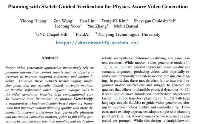 这项突破性研究由北卡罗来纳大学教堂山分校的黄懿东、王尊、林翰、张悦、班萨尔·莫希特教授,联合FieldAI公司的金东基、沙耶根·奥米德沙菲,以及南洋理工大学的尹在宏教授共同完成,发表于2025年11月的arXiv预印本平台,论文编号为arXiv:2511.17450v1。这项名为"SketchVerify"的创新框架,首次让AI能够像电影导演一样,在正式拍摄前用草图预演来完善运动规划,从而生成更符合物理定律的视频内容。