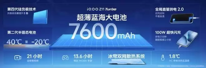 续航充电方面,iQOO Z11 Turbo内置7600mAh超薄蓝海大电池,第四代硅负极技术,能量密度达iQOO全系最高的860Wh/L。支持100W超快闪充与全局直驱供电2.0技术。
