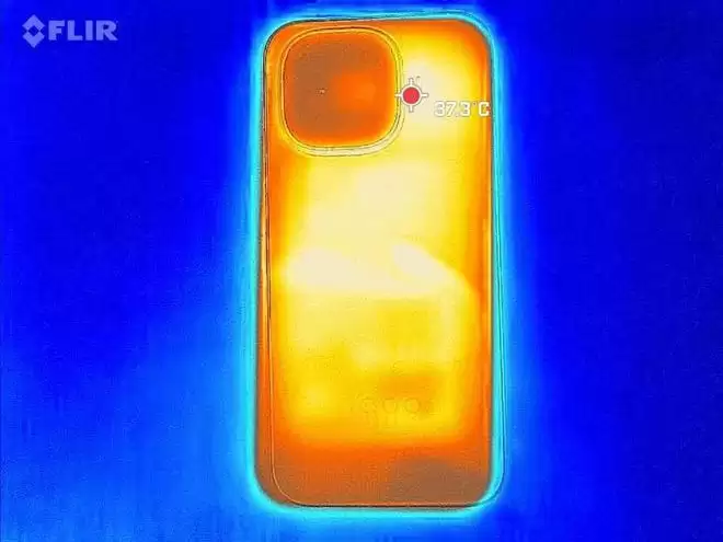 而机身背面最高温度连40度都不到,从测温图也能看出来,整机均热这块做得确实很到位,机身背部只是温热,完全没有达到烫手的程度。