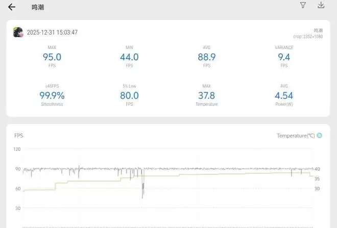 我特地用一个渠道服版本的《鸣潮》测试,在游戏工具箱里开启“优化功耗”的插帧模式后,SoC本身的渲染压力被大幅分摊。实测在跑图打怪的场景中,画面流畅度被补偿到了88.94帧,而此时的整机功耗被死死按在了4.94W。