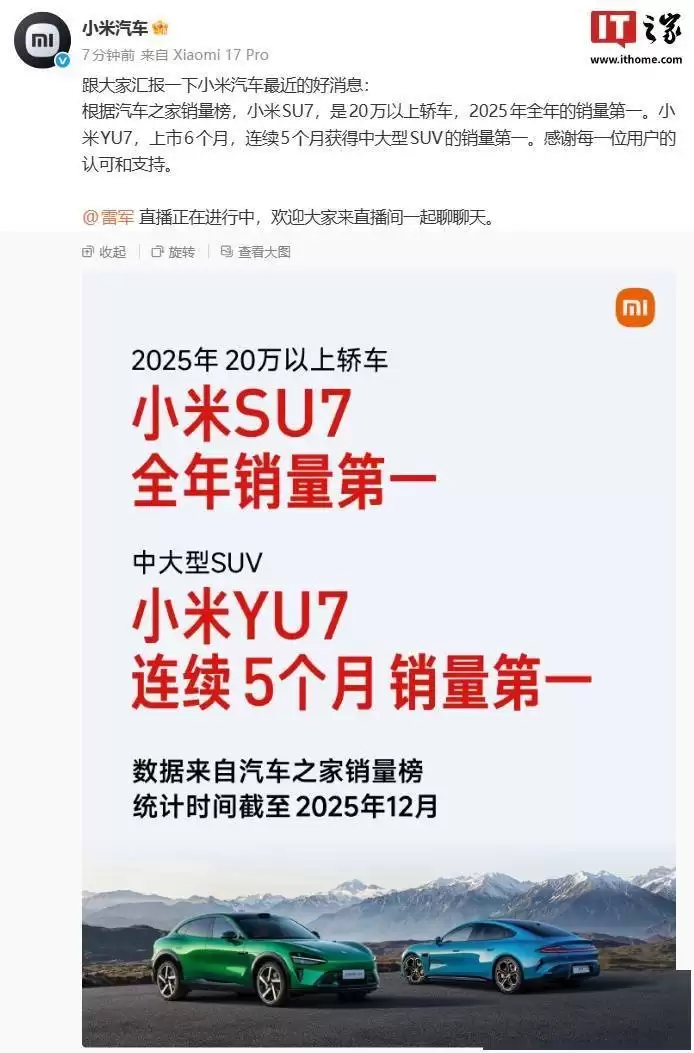 2025年小米汽车成绩单:SU7与YU7销量夺冠,新一代SU7即将上市