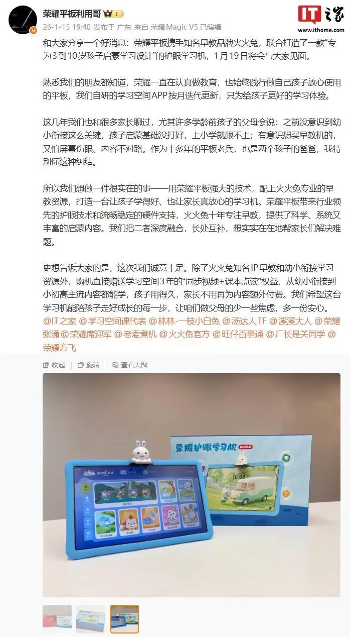 IT之家1月15日消息,荣耀终端股份有限公司平板与IoT产品领域总经理“荣耀平板利用哥”今日透露,荣耀平板已与早教品牌“火火兔”达成合作,共同推出了一款专为3至10岁儿童启蒙学习设计的护眼学习机。这款新品将于1月19日正式亮相。