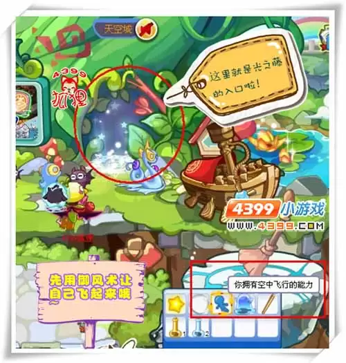 光之藤的入口位于天空城。想进去的话,第一步就是掌握御风术。接近入口时,打开“魔法”界面,选择“飞行状态”即可。保持这个状态,你就能轻松进入光之藤了。