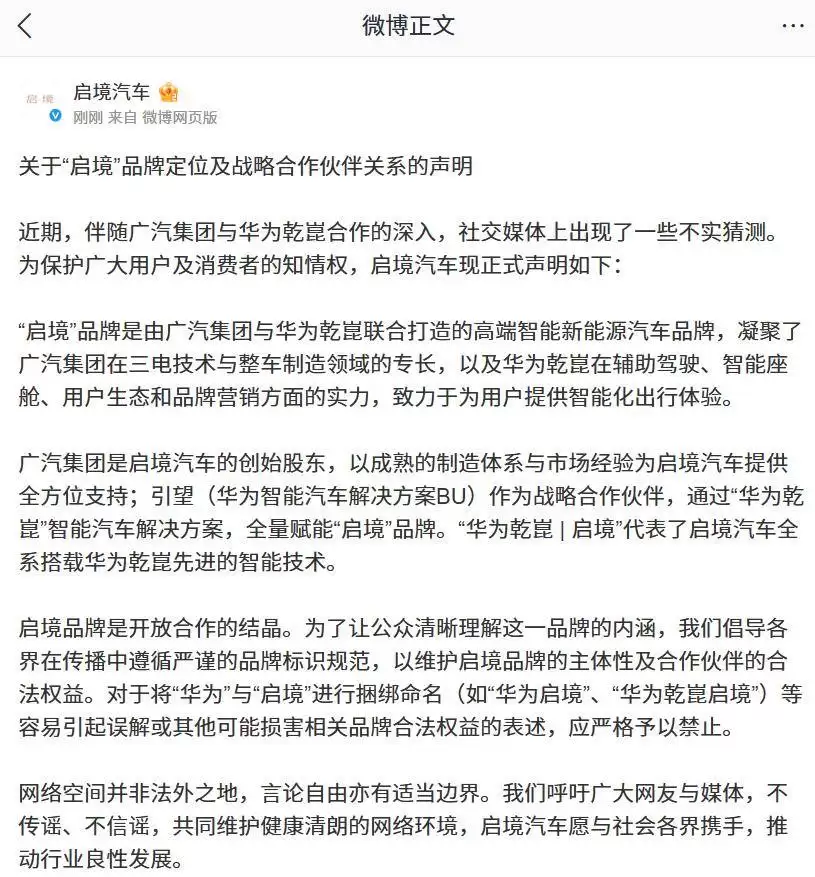 近日,针对社交媒体上围绕广汽集团与华为乾崑合作项目的种种猜测,启境汽车通过最新微博发布正式声明,就品牌定位及战略合作伙伴关系作出详细说明,旨在澄清事实、维护用户知情权。