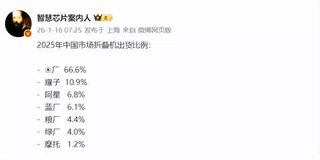 这个预测能否成真,目前还说不准。但要在国内折叠屏手机市场里说“只有华为和其它”,恐怕没人会反对。事实确实如此,不信大家可以看看行业人士“智慧芯片案内人”提供的2025年国内折叠屏手机市场份额排名。数据显示,华为稳居第一,其市场份额高达66.6%。换句话说,华为一家就占据了整个市场近七成的份额,其他所有品牌加起来也难与其匹敌。令人有些意外的是,荣耀排名第二,市场份额为10.9%。荣耀也是除华为外,唯一一个市场份额达到两位数的品牌。这说明荣耀的折叠屏手机在国内紧随华为之后,整体市场认可度相当高。