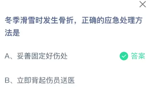 冬季在滑雪时不慎发生骨折,如何进行正确的应急处理呢?支付宝小鸡课堂开课啦!每天只需花费一分钟答题就能赚取饲料,喂养小鸡的同时还能奉献爱心,既轻松又有意义!2026年1月16日蚂蚁庄园的小鸡课堂题目正确答案是【妥善固定好伤处】,冬季滑雪时发生骨折,正确的应急处理方法是妥善固定好伤处。