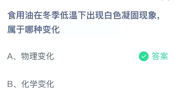 每到冬天,家里的食用油有时会悄悄凝固成白色的固体,这是怎么回事呢?这是哪种变化呢?支付宝小鸡课堂准时开课,每天花一分钟参与答题,喂喂小鸡就能贡献一份爱心,轻松又有意义!2026年1月16日蚂蚁庄园小鸡课堂题目的正确答案是【物理变化】。食用油脂在低温下出现的凝固现象,属于物理变化。