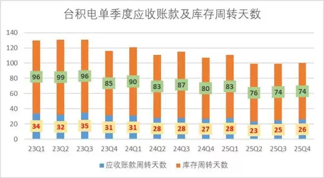 四季度台积电的期间费用整体仅有8.4%,创过去五年间的新低,主要的成本项折旧摊销率,也大幅滑落至15%上下浮动,并且从产业链的角度来看,台积电的地位明显提升,应收账款周转天数,自2024年以来,下降了26天,库存周转的天数下降了8天,目前整体的库存周转天数仅为26天。