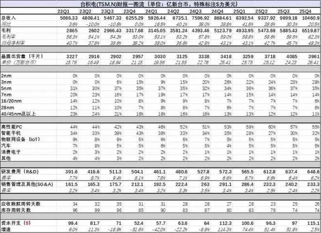 台积电的业务结构相对简单,绝大多数收入均来自于晶圆加工,每月也会按时披露业绩情况,因此,针对季报我们的分析,主要有两个落脚点: