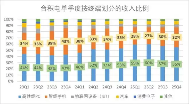 从收入占比结构来看,第四季度智能手机占收入的32%,HPC占收入的55%,二者累计贡献了台积电87%的收入,与前三季度持平。