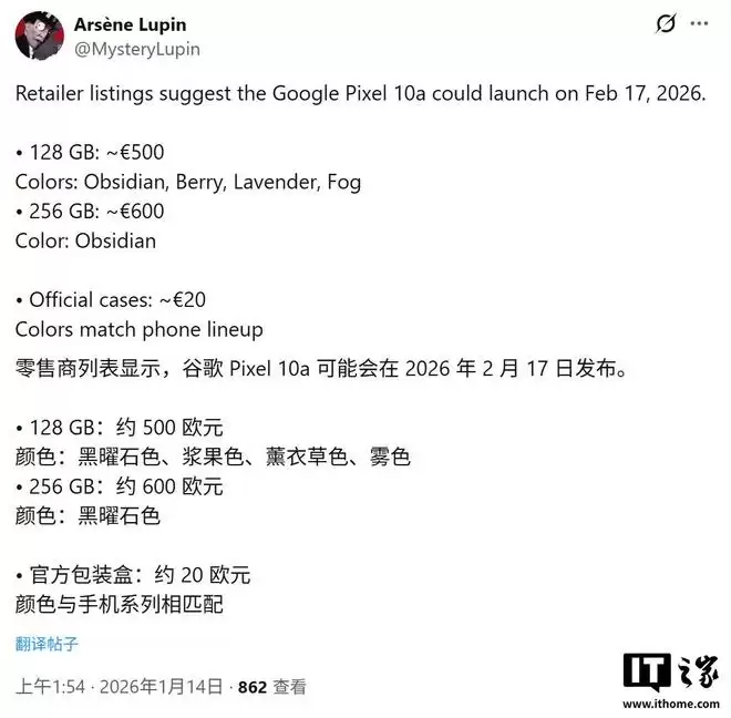 1月16日消息,知名社区IT之家援引爆料者@MysteryLupin于1月14日在X平台发布的信息称,谷歌预计将于2026年2月17日正式推出Pixel 10a手机。在当前全球电子元器件成本上涨、成品价格普遍承压的大环境下,这款新机的128GB版本定价却可能下探至500欧元左右(IT之家注:按当前汇率约合人民币4052元),相比前代Pixel 9a的发售价(549欧元)低了约50欧元,降幅接近9.11%。