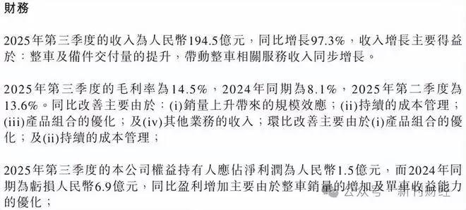 根据零跑财报,其2025年上半年营收录得242.5亿元,净利润仅为0.3亿元。这意味着其净利率低至0.12%。在随后的第三季度,随着销量和毛利润的双重提升,净利润爬升至1.5亿元,不过,整体盈利能力在强敌环伺的资本市场中依然显得较为脆弱。