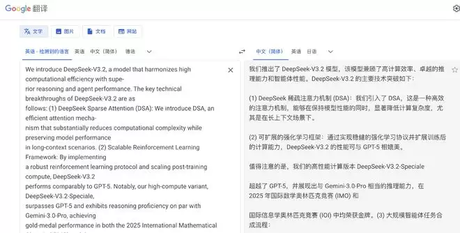 再来看看谷歌翻译,它将“We introduce DeepSeek-V3.2”翻译成了“我们推出了DeepSeek-V3.2模型”,更接近日常表达。在一些专业词汇上的翻译也更为精准,但小缺点是没有对原文断句进行优化。