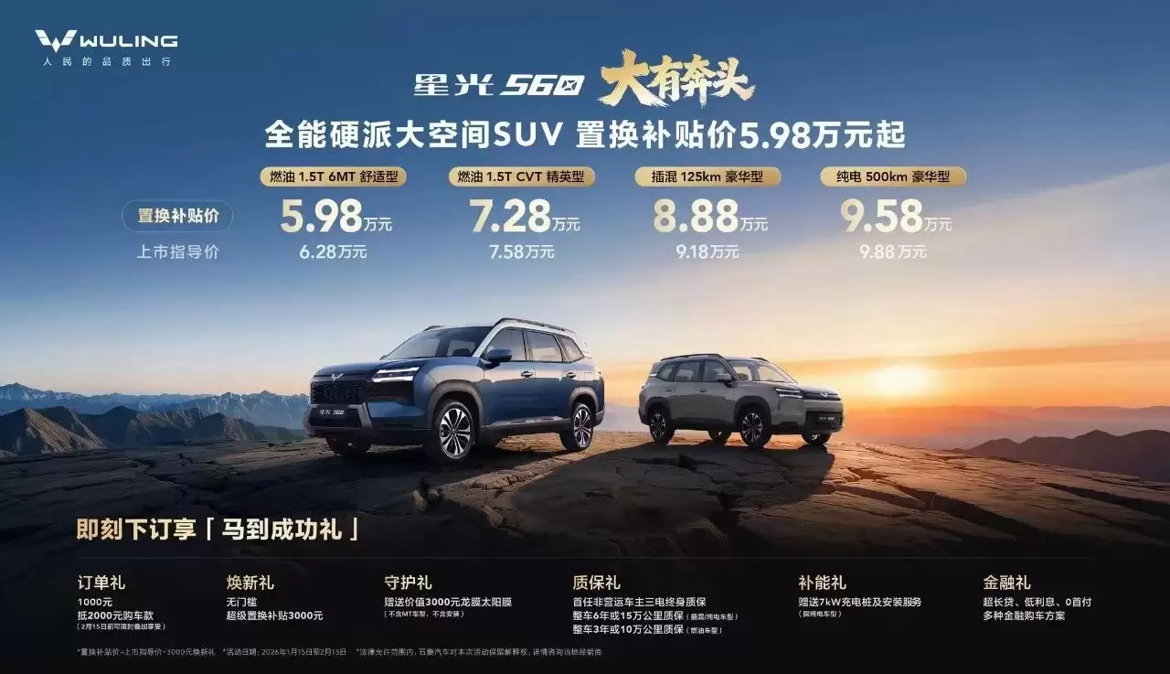 近日,备受瞩目的全能硬派大空间SUV——五菱星云560正式登陆市场。此次共推出四款车型,覆盖燃油、插混、纯电三大动力类型,包括燃油1.5T+6MT舒适型、燃油1.5T+CVT精英型、插混125km豪华型以及纯电500km豪华型,最新指导价区间为6.28万元至9.88万元,置换补贴后价格下探至5.98万元至9.58万元,成为6万级市场中唯一的中型SUV。