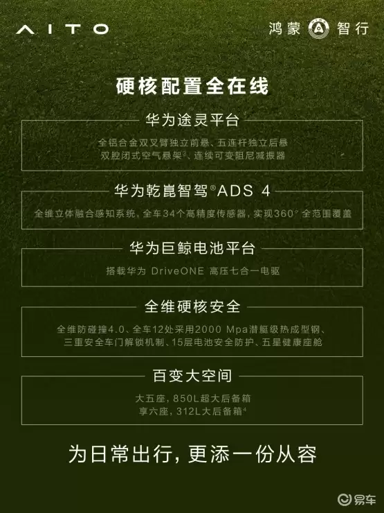 在用户关注的智能驾驶领域,新车配备华为乾崑智驾ADS+4系统,通过34个高精度感知硬件构建起360度防护网。该系统可精准识别各类动静态目标,包括异形障碍物和极端天气下的悬浮物,配合全维防碰撞系统CAS+4.0,形成从感知到决策的完整安全闭环。底盘方面,途灵平台赋予车辆全铝合金双叉臂前悬、五连杆后悬、双腔空气悬架及CDC减震器,在舒适性与操控性之间找到最佳平衡点。