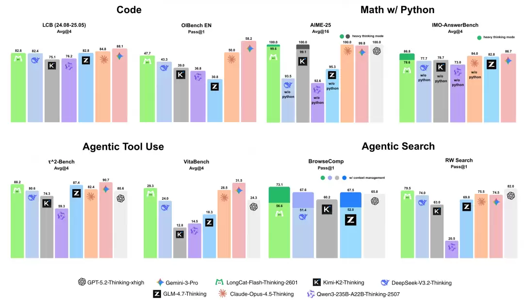 编程能力方面:LongCat-Flash-Thinking-2601在LCB评测中取得82.8分,OIBench EN评测获得47.7分,成绩处于同类模型第一梯队,展现出扎实的代码基础能力。数学推理能力:在开启深度思考模式后表现突出,LongCat-Flash-Thinking-2601在AIME-25评测中获得满分,IMO-AnswerBench中则以86.8分达到当前先进水平。智能体工具调用能力:在τ²-Bench评测中拿到88.2分,VitaBench评测中获得29.3分,均获得开源领域的领先水准,在多领域工具调用场景下表现优异,适配实际应用需求。智能体搜索能力:在BrowseComp任务中取得73.1分,RW Search评测获79.5分,LongCat-Flash-Thinking-2601具备强劲的信息检索与场景适配能力,达到开源领先水平。